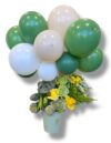 Arrangement of green flowers with a teddy bear and balloons 30*60 cm