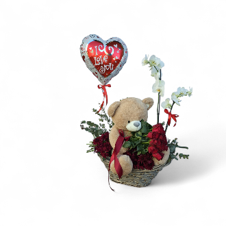 Orchid Plant Arrangement with a Teddy Bear & Red Roses