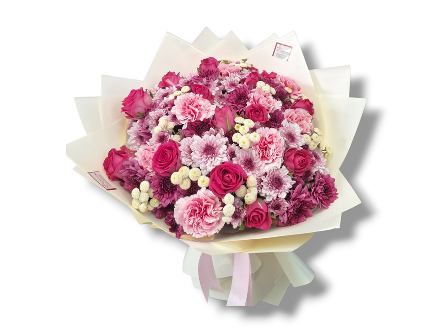 White & pink roses with Gypsophile in a unique warpping 30*40 cm