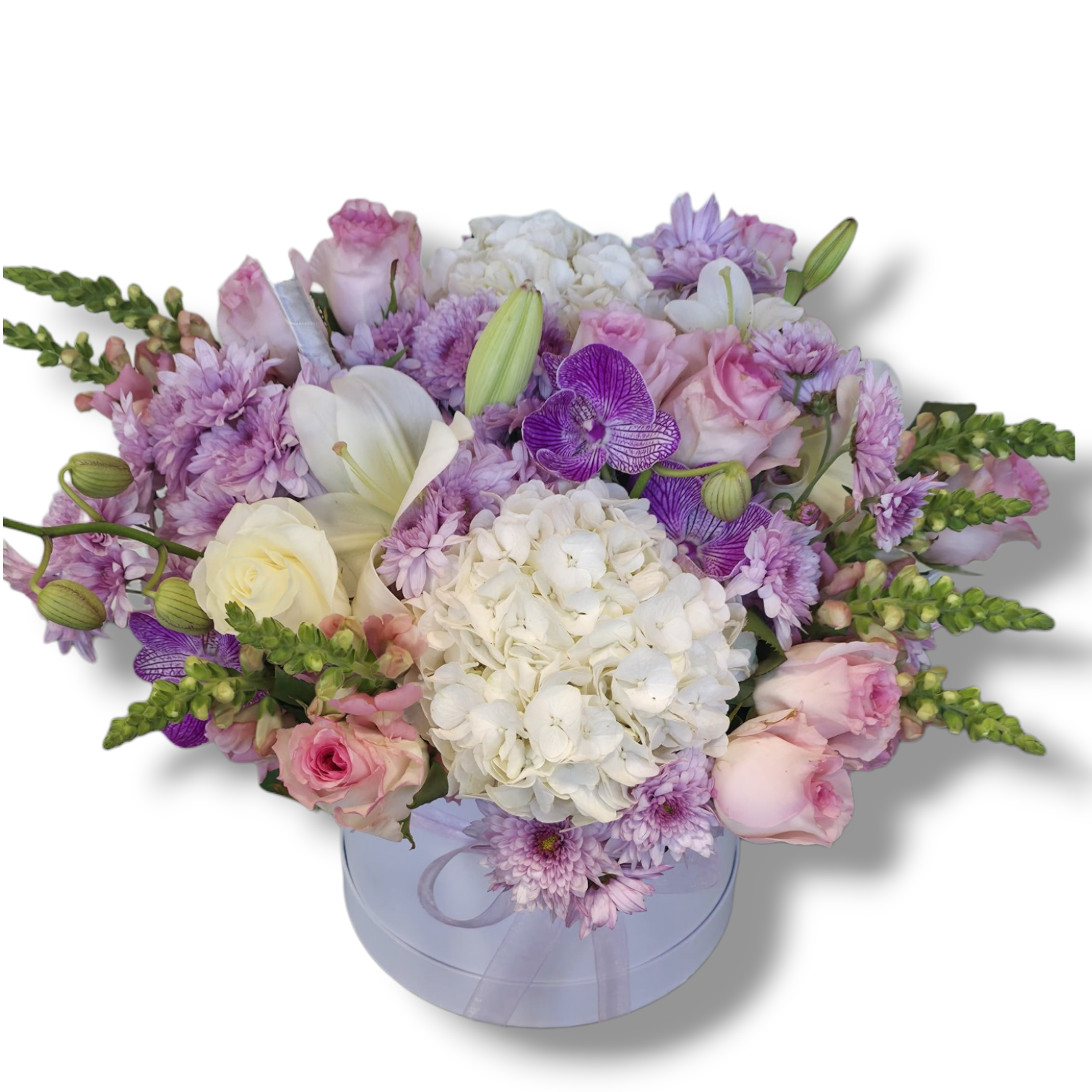 Arrangement of a mix of flowers in a white Box 40*40cm