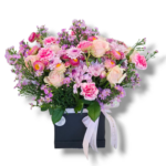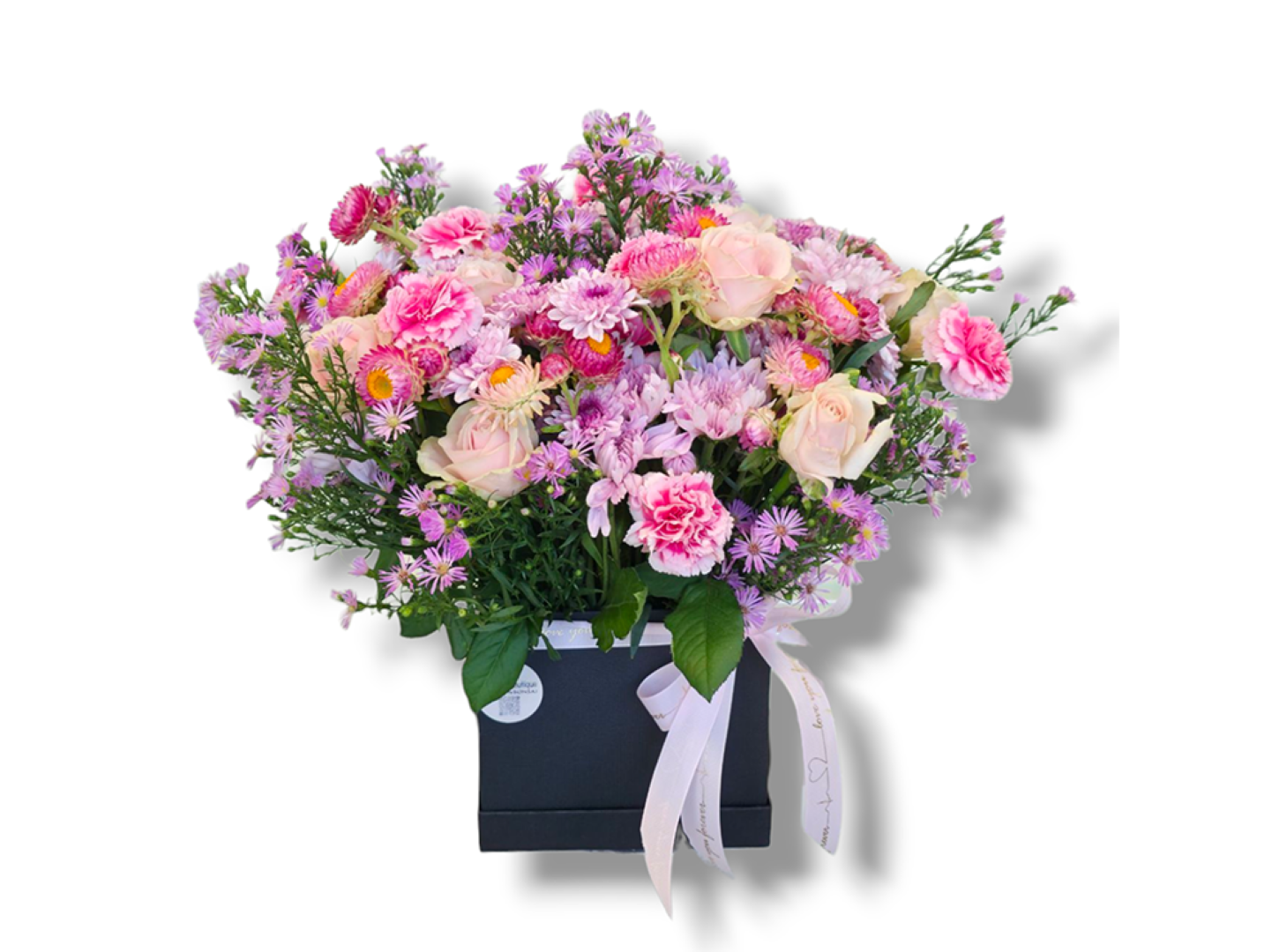 Mixed flowers arrangement pink colors in a box 25*30 cm