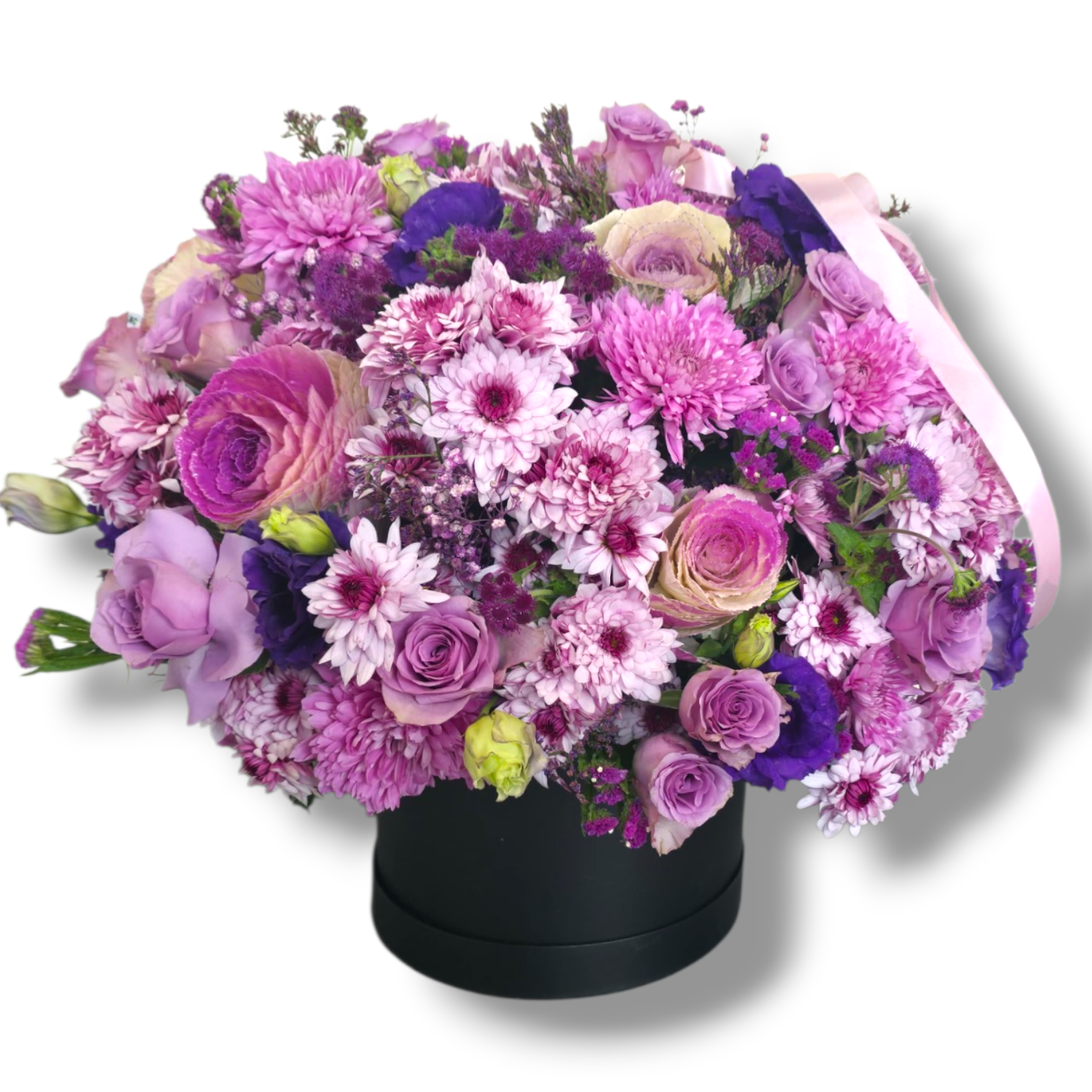 Arrangement of a mix of pink and purple flowers in a Box 50*50cm
