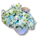 Arrangement of white and blue flowers with a teddy bear 50*50 cm