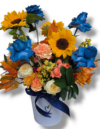 Mixed arrangement in a ceramic pot with blue and white flowers 40*40