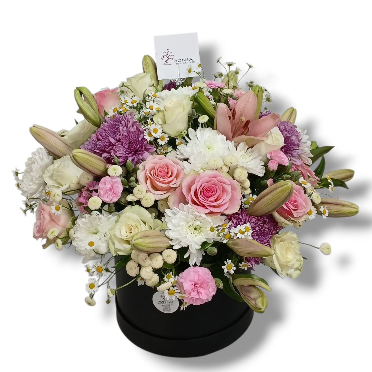 Arrangement of a mix of white and pink flowers in a Box 50*50cm